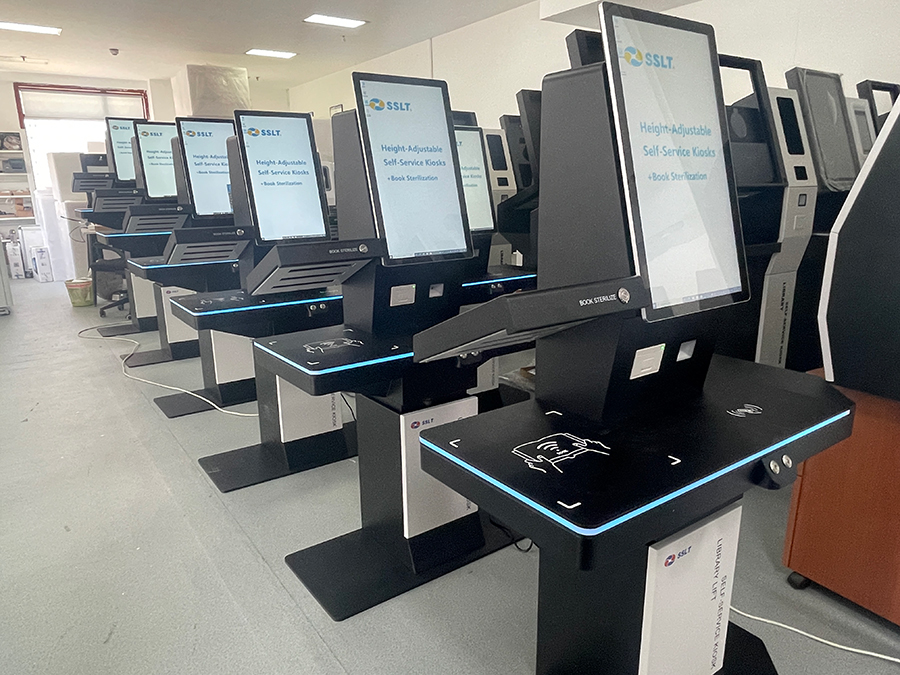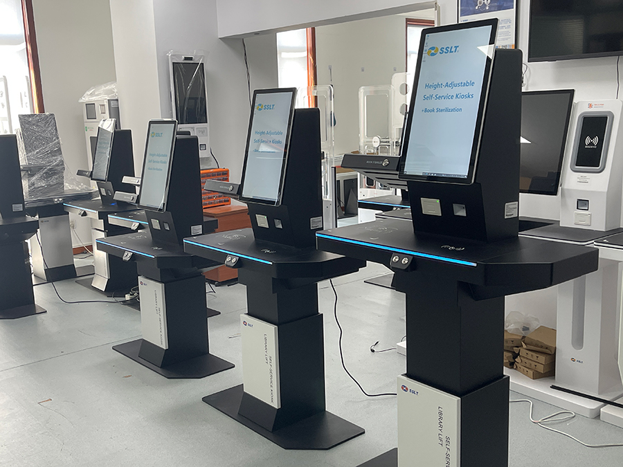 The SSLT EA60 lifting-type EM magnetic stripe self-service book KIOSK has functions such as book borrowing and returning, query, renewal, and book replenishment and cancellation verification. Readers of different age groups (children, adults, the elderly, and the disabled) can adjust the working surface to a desired height by pressing buttons. It can be upgraded to an EM+RFID hybrid self-service lifting borrowing and returning integrated machine according to the actual needs of the library. It can also be equipped with a book sterilization function as an optional feature.